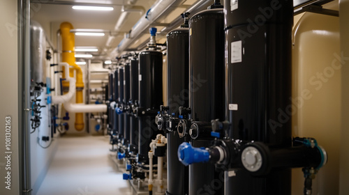 Zaawansowane systemy filtracyjne w zakładzie uzdatniania wody, z widoczną separacją czystej i brudnej wody.