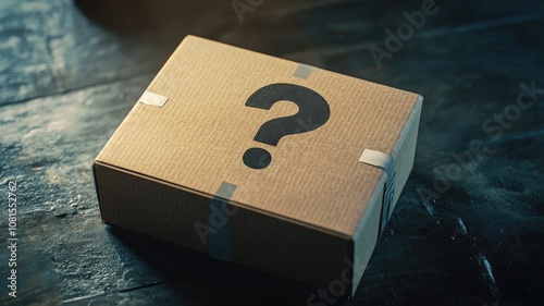 Sealed cardboard box with large question mark on top, suggesting mystery