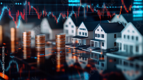 A line of model houses in ascending order with coins stacked in increasing heights beside each, symbolizing real estate market growth, with charts and graphs subtly overlayed in th