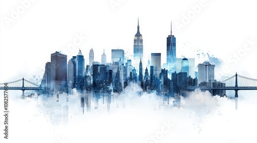 An intricate city silhouette outline featuring skyscrapers, rooftops, and bridges, standing against a stark white background, perfect for design and creativity.