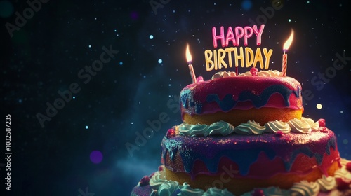 A multi-tiered birthday cake with colorful icing and candles in the night sky. Color animation stills in the style of various artists, AI Generative