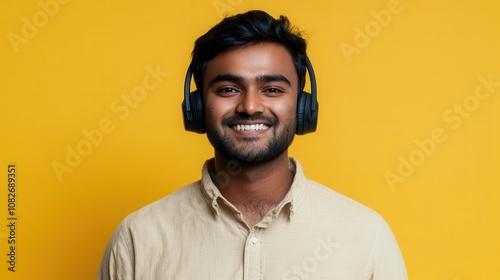 close-up of cheerful indian male customer support representative, headphones on, engaging directly with a confident smile