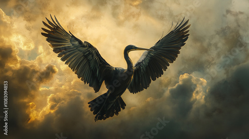 Sylwetka ptaka w miękkim, dramatycznym świetle, które uwydatnia jego strukturalne pióra, na tle ponurego, chmurnego nieba.