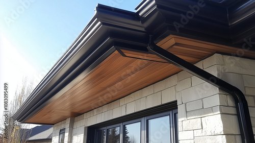Współczesne rynny w matowej czerni zestawione z naturalnym drewnianym wykończeniem sufitu, tworzą wyrafinowany detal architektoniczny.