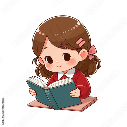 A cute little girl reads a book against the backdrop of autumn leaves isolated on white background