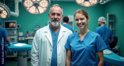 Lekarz i pielęgniarka pozują do zdjęcia na sali operacyjnej. Na zdjęciu panuje luźna i profesionalna atmosfera. Dzień jak codzień w szpitalu.