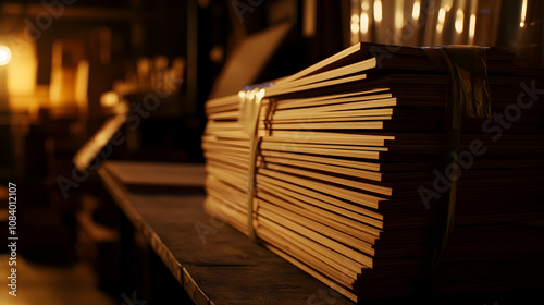 Close-up of bundled lumber in a dimly lit warehouse with detailed textures