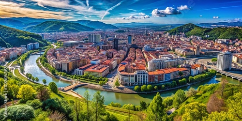 Stunning Aerial View from Mount Artxanda Overlooking Bilbao's Urban Landscape with Lush Greenery and Modern Architecture Under a Clear Blue Sky