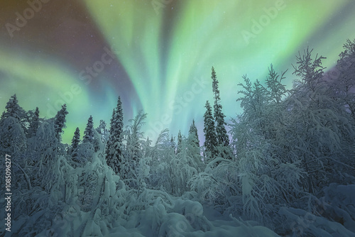 Snowy forest with trees covered in snow. The sky is filled with auroras, creating a beautiful and serene atmosphere. Concept of wonder and awe