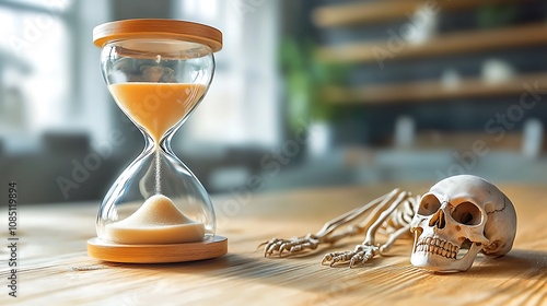 The sand of time pours endlessly through the hourglass, symbolizing the fleeting nature of life and the inevitable march towards death