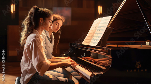 A lesbian couple enjoys an intimate moment as they play a duet on a grand piano, surrounded by warm light and a pride-themed music stand cover during the evening
