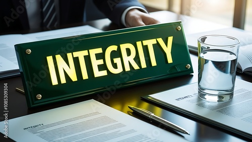 Businessperson's desk with "Integrity" sign, documents, and water glass.