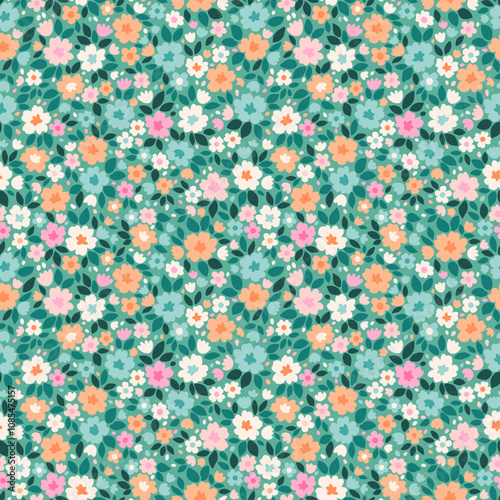 Cute floral background. Floral pattern with small pastel coral flowers on a blue background. Seamless pattern for design and fashion prints. Ditsy style. Stock vector illustration.