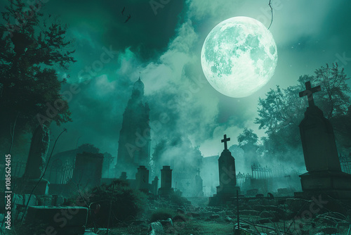 Fantastically mysterious cemetery with tombstones and scary atmosphere