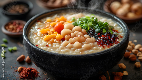 A Visually Rich Still Life of a Steaming Bowl of Laba Congee with Colorful Toppings and Traditional Elements