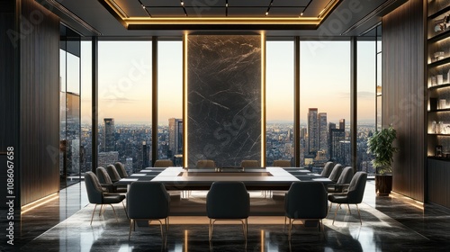 Luxury meeting room with panoramic city view and bla nk gray wall. Presentation and corporate concept. 3D Rendering