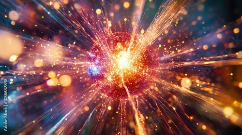 Hyper-detailed illustration of a quark proton, highlighting its intrinsic properties with explosive cosmic energy and vibrant particle dynamics.