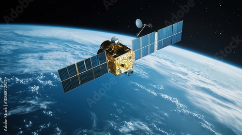 Satellite Orbiting Earth: A high-resolution image of a communications satellite orbiting Earth, capturing its intricate design and the vastness of space.