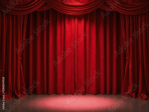 Red stage curtain illuminated by a single spotlight, entertainment, elegant