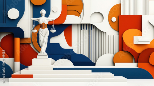 Abstract artwork featuring a Lady Justice sculpture in front of a geometric, colorful background with blue, orange, and white shapes.