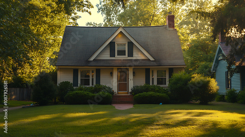Charming cape cod style house exterior in warm golden hour lighting architectural photography