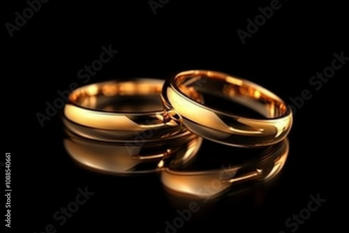 Two gold wedding rings shining on black backdrop, symbolizing eternal love and unity in marriage.