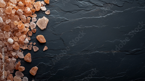 Rozsypane kryształki różowej soli himalajskiej na czarnym, kamiennym tle, eksponują jej naturalne piękno pozostawiając miejsce na dodatkowy opis.