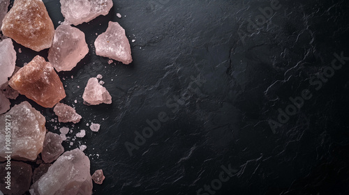 Rozsypane kryształki różowej soli himalajskiej na czarnym, kamiennym tle, eksponują jej naturalne piękno pozostawiając miejsce na dodatkowy opis.