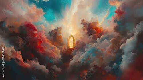 Heavenly golden gate at the top of a staircase surrounded by radiant clouds and celestial light.
