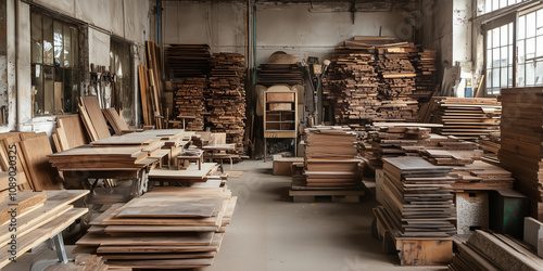 Panele drewniane, równomiernie ułożone w pracowni fabryki mebli, odzwierciedlają gotowość do tworzenia wyrobów.
