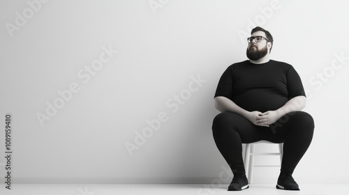 Corpulent man sitting on a chair in a minimalistic indoor setting. Generative AI