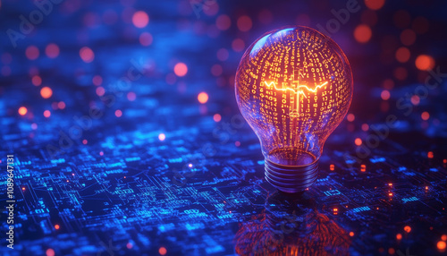 glowing light bulb with binary code and circuit patterns symbolizes innovation and technology. vibrant colors create futuristic atmosphere, representing fusion of ideas and digital advancement