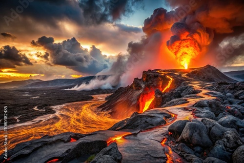 Dramatic Volcanic Landscape with Lava Flow and Rugged Terrain, Showcasing Nature's Power and Intensity for Stunning Visuals