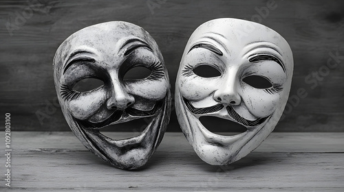 A Visually Striking Grey Scale Depiction of the Laugh Now Cry Later Concept Using Drama Masks with a Simply White Background