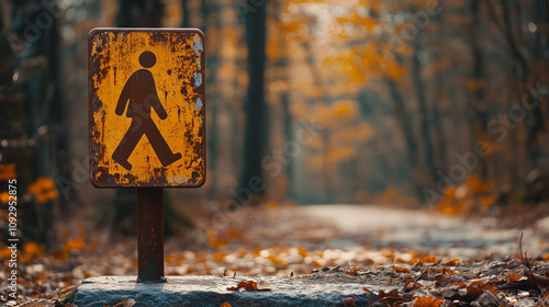 Stary, pokryty rdzą znak przejścia dla pieszych w otoczeniu natury, pośród drzew.