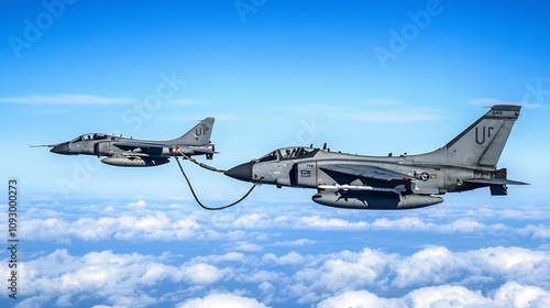 Two powerful jet fighter aircraft refueling mid air against a backdrop of a bright blue sky during a critical military or combat mission