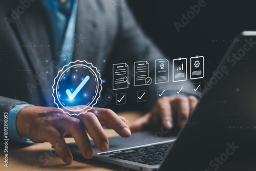 Certification and quality control standards, best quality assurance, guarantee Concept, businessman showing standard management with quality mark and accepting regulatory requirement on laptop