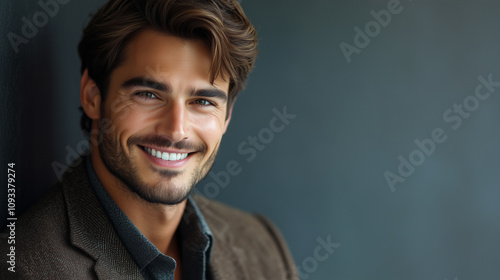 Pewny siebie mężczyzna z nienagannym wyglądem i przyjaznym uśmiechem, idealnie łączący wdzięk i naturalność w swojej postawie.