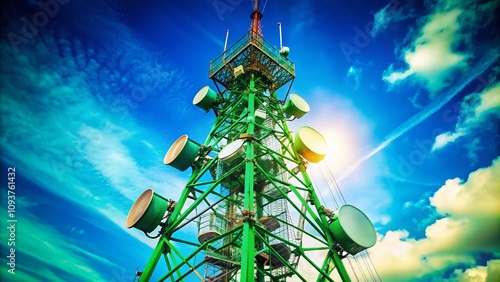 Vintage Style Photography of a Green Telecommunication Tower with Microwave Link and TV Transmitter Antennas Against a Bright Blue Sky, Showcasing Wireless Technology and Connectivity