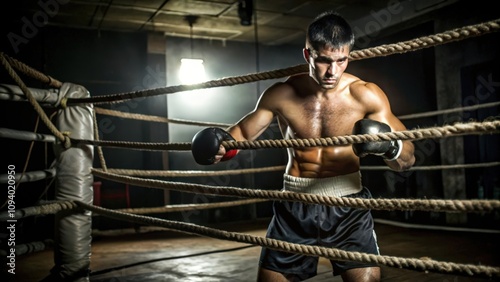 A Boxer Holding onto the Ropes in a Boxing Ring