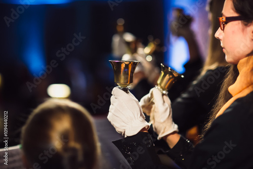 Musicians performing with handbells at a formal concert