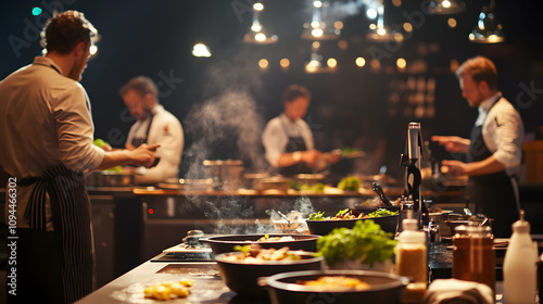 A glamorous cooking show finale with chefs showcasing their final dishes to judges.