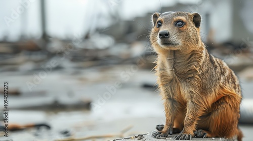 Striking Image of Endangered Mongoose Amidst Environmentally Degraded Landscape of Ruins