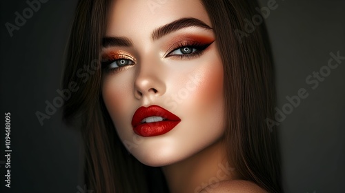 portret, kobieta, profesjonalna fotografia, makijaż artystyczny, aparatem Canon, brązowe proste włosy, realistyczne zdjęcie, fotografia studyjna, bliskie ujęcie, realistyczne detale, wyraz twarzy, pro