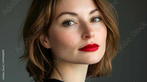 portret, kobieta, profesjonalna fotografia, makijaż artystyczny, aparatem Canon, brązowe proste włosy, realistyczne zdjęcie, fotografia studyjna, bliskie ujęcie, realistyczne detale, wyraz twarzy, pro