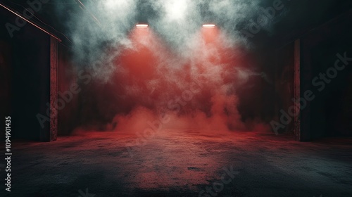The dark stage shows, an empty dark scene, neon light, and spotlights The concrete floor and studio room with smoke float up the interior texture for display products.