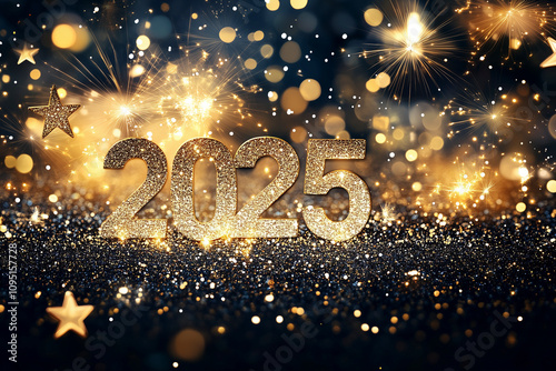 Goldene Jahreszahl 2025 - Glückwünsche und Grüße zum neuen Jahr, Silvester und Neujahr 2025 in goldener glamouröser Schrift mit Feuerwerk
