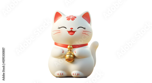 A cute 3D illustration of a white Maneki-neko (lucky cat) with a smiling face, holding a golden bell and wearing a red collar. Traditional Japanese figurine symbolizing good luck and fortune.
