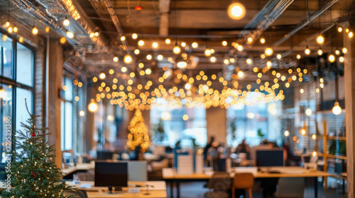 Modern open-plan office decorated for the holidays with twinkling lights and a festive atmosphere