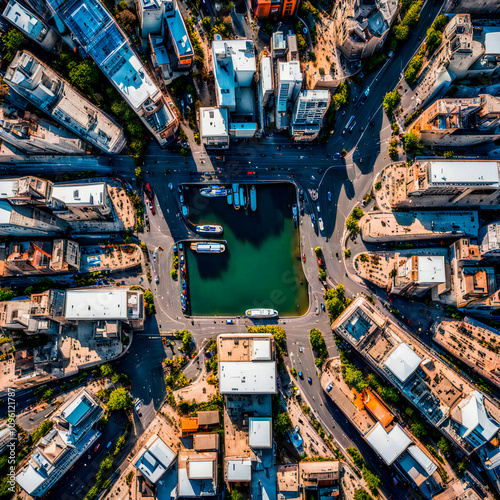 Aerial photography captures the dynamic essence of urban life, colorful graffiti exploding against the grey concrete, markets alive with a mosaic of commerce, streets thronging with the perpetual moti